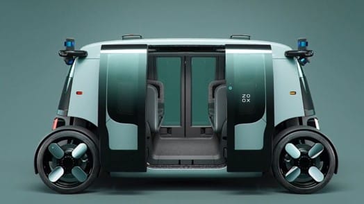 Zoox의 로보택시는 자율 주행을 위해 기존 자동차를 개조하는 대신 맨 처음부터 완전 자율 차량으로 제작되었으며 스티어링 휠이나 페달이 없으며 4명의 승객이 서로 마주보고 앉을 수 있는 공간이 있습니다.