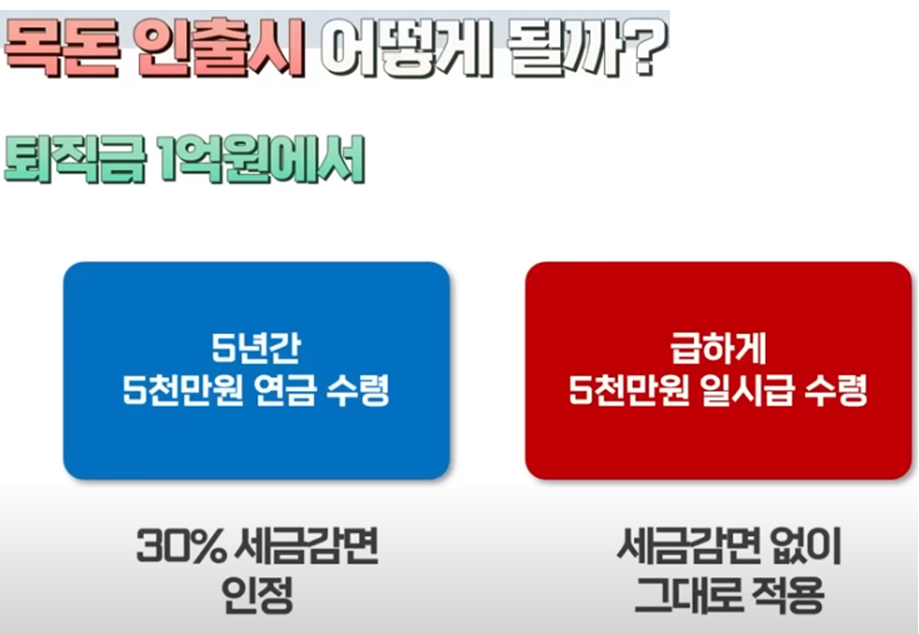 운용수익이 인출될 때는 연금소득세율이 적용되는데요 나이에 따라 3.3%에서 5.5%가 적용이 됩니다 그리고 내가 연금을 받다가 큰 목돈이 필요한 경우는 어떻게 될까요 총 1억원의 퇴직금에서 5년간 5천만원을 연금으로 수령하던 중 나머지 5천만원이 급하게 필요해서 인출해야 할 상황입니다 이때 5년간 30% 감면된 부분은 그대로 인정이 되고요 인출하는 5천만원에 대해서만 퇴직 소득세가 감면없이 적용됩니다 즉 딱히 페널티가 없이 원하는 대로 인출이 가능하다는 것이죠