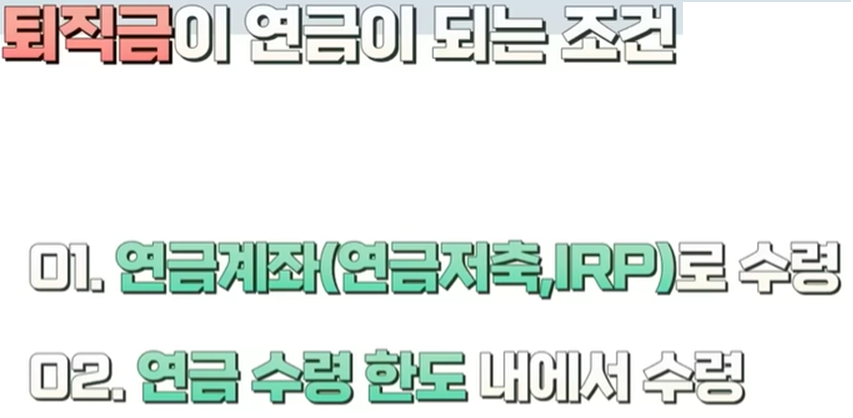 퇴직금을 받을 때 반드시 알아야 할 두 번째는 퇴직금이 연금이 되기 위한 조건입니다 퇴직금을 연금으로 받으면 세금 감면 및 과세이언 혜택이 있다고 말씀드렸는데요 여기서 중요한 포인트는 바로 퇴직금을 연금으로 받는 것이겠죠 퇴직금이 연금이 되려면 두 가지 조건이 충족되어야 합니다 첫 번째 IRP 연금저축 같은 연금 계좌로 받아야 하고요 두 번째 연금 수령 한도 내에서 수령을 해야 합니다