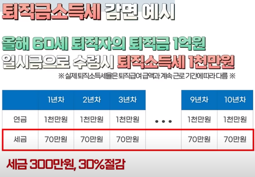 예를 들어 올해 60세인 퇴직자가 퇴직금으로 1억원을 받고요 여기에 일시금으로 수령시 퇴직 소득세로 1000만원이 나온다고 가정해 보겠습니다 이걸 연금으로 10년에 걸쳐 1000만원씩 나눠서 수령하면 세 1년에 100만원씩 나오는데요 여기에 30%를 감면해 줘서 70만원이 됩니다 이렇게 10년을 받으면 세금이 1000만원 중 300만원이나 절감되는 것이죠