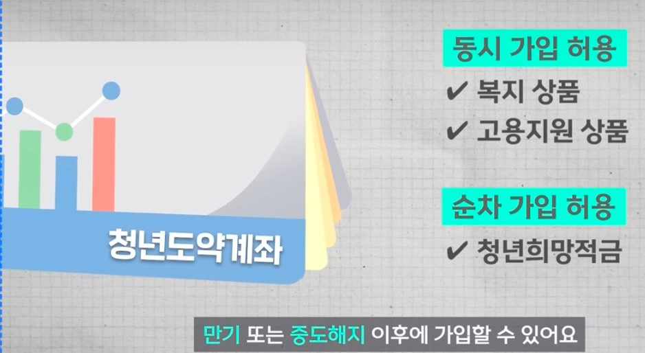 청년 레이저축 계좌나 각종 지방자치단체 상품 등 복지 상품과 고용지원 상품과는 동시가액이 허용되고요 다만 사업 목적이 유사한 청년 희망적금과는 중복가입이 안되서 만기 또는 중도해지 이후에 가입할 수 있어요
