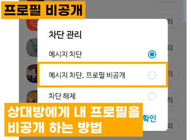 기본적으로 할 땐 이렇게 메시지 차단으로 되어 있기 때문에 내 프로필도 보여주고 싶지 않다라고 하면 메시지 차단 프로필 비공개 확인해 주시면 되고 혹시라도 잘못 누가 차단이 됐다라고 하실 경우에는 이렇게 차단해제 하시고 확인 눌러 주시면 다시 차단 해제를 할 수가 있습니다