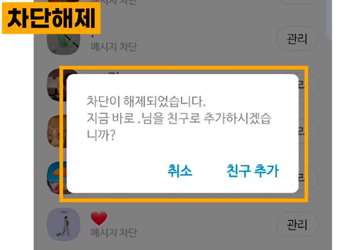 차단 해제 확인 눌러 보시면 차단이 해제되었습니다 지금 바로 다시 친구로 추가하실 건가요 이렇게 물어보게 돼요 그래서 여기서 내가 다시 친구 추가를 하겠다라고 하게 되면 친구 목록으로 가면 다시 그 사람이 추가된 걸 확인할 수가 있습니다