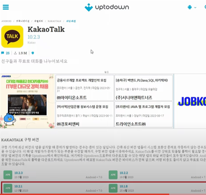 그 다음에 업터 다운이라는 사이트가 있거든요 여기에서 카카오톡 지난 버전 설치를 할 수가 있어요 이왕이면 저는 뭐 최신걸 받는게 나을 것 같아서 10.5.8 정도 버전을 설치를 하신 다음에 이제 까시면 다시 카톡 실행이 되잖아요 그걸 다시 또 다시 백업 받으셔서 다시 그렇게 진행하시면 원래 없었던 이제 목록 분리라는게 보일 거예요