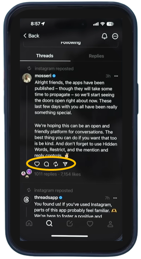 Threads 앱에서는 검색 기능을 통해 다른 사용자를 찾고 팔로우할 수 있다.