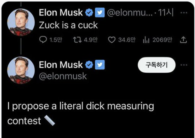 그 중에서도 이번 튀위터의 머스크가 도전장을 내밀었는데요 다름이 아닌 꽈추 크기 대결의 경우는 특히 더 주목을 받고 있습니다.