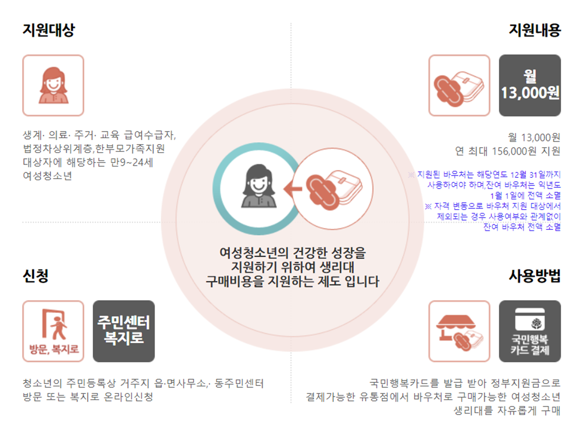 "생리시 불편함을 완화할 수 있는 청소녀 생리품을 지급합니다. 지금 신청하세요."