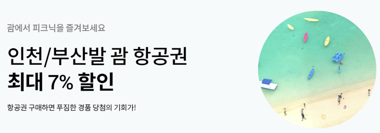추첨을 통해 여행용 가방, 담요, 피크닉 매트, 여행용 파우치 세트 등의 여행용품도 증정합니다. 괌 노선 항공권을 예매하고 프로모션 페이지에서 ‘응모하기’ 버튼을 누르면 참여할 수 있습니다. 유·소아 동반 시에는 당첨 확률이 더욱 올라갑니다.