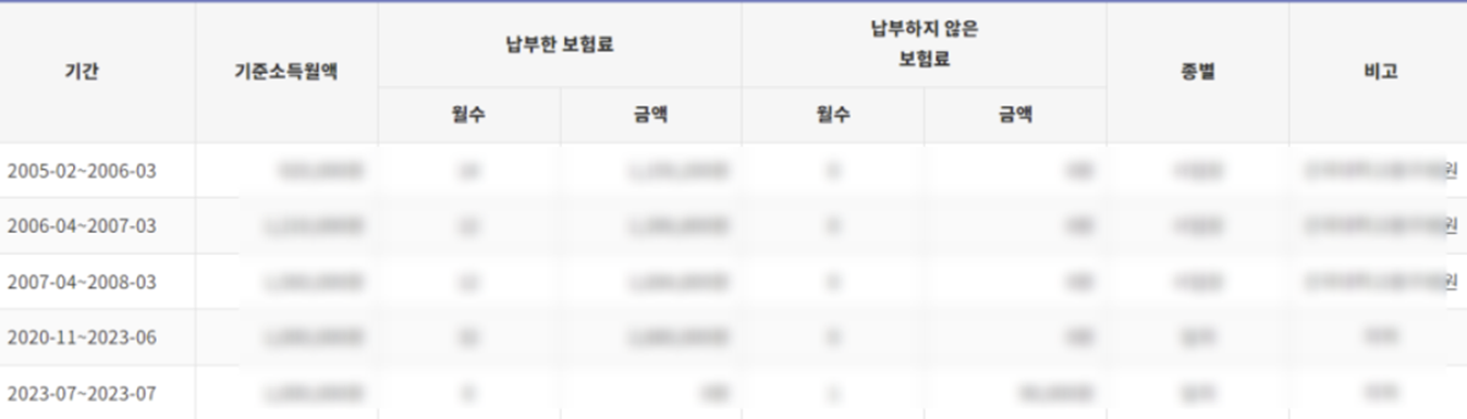 기간별로 상세내역을 확인할 수 있으며 기준소득월액에 따른 월수별 납부액과 현재 기준(2023년 이후)의 보험료를 확인할수있습니다