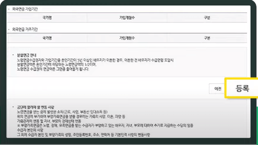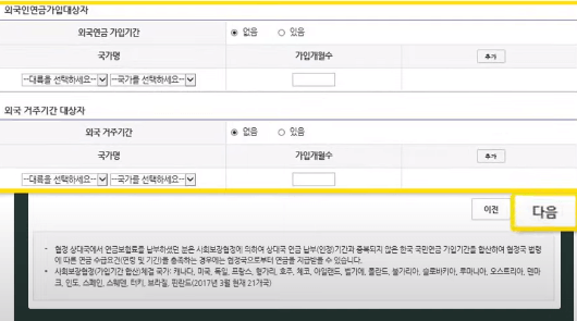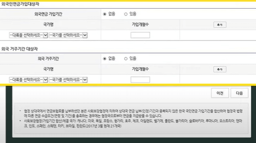 ▶ 외국 연금의 가입했던 기간이나 외국에서 거주한 기간이 있는 경우 입력하시고 없다면 다음이 선택해주세요
