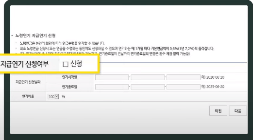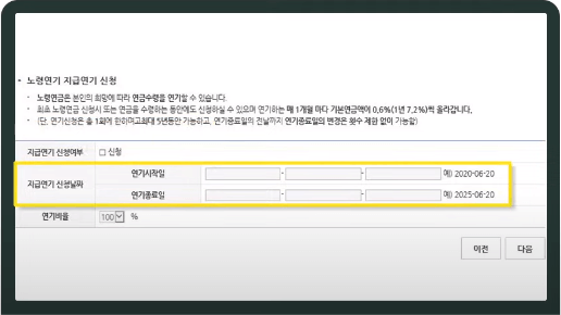 지금 연기 신청 연금을 받는 시기를 늦추고 싶다면 지급 영계 신청 여부를 체크 하시고 연기 기간 시작일과 종료일 모두 입력해 주세요 연기 비율은 연금액의 50% 부터 100% 까지 10% 단위로 선택 가능합니다