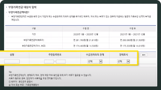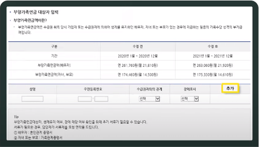 ▶ 1단계: 부양가족 연금대상자 입력 만약 대상자가 2명 이상일 경우 대상자 추가 버튼을 선택해 입력하세요