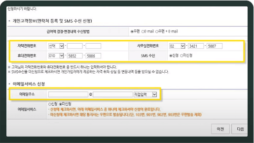 ▶ 전화번호 및 이메일주소는 정확하게 입력해주셔야 합니다 그리고 우측하단 "다음" 버튼(클릭)