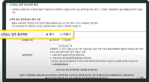 ▶ 3단계: 소득 있는 업무 종사 여부 확인 기준금액 이상의 소득이 있으신 분은 종사를 클릭하시고 연간 총소득 금액을 입력한 뒤 확인 을 체크하세요