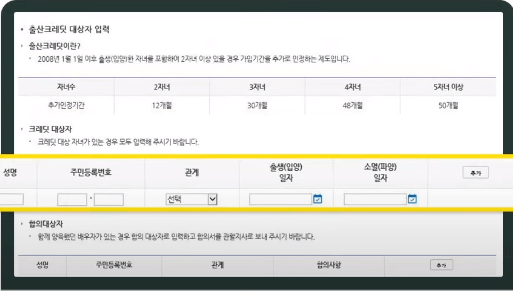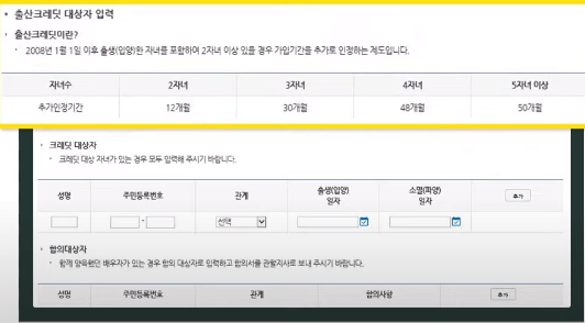 출산크레딧 대상 자녀가 있는 경우 성명, 주민드록번호, 관계 출생(입양)일자, 소멸(파양)일자를 입력해주세요!