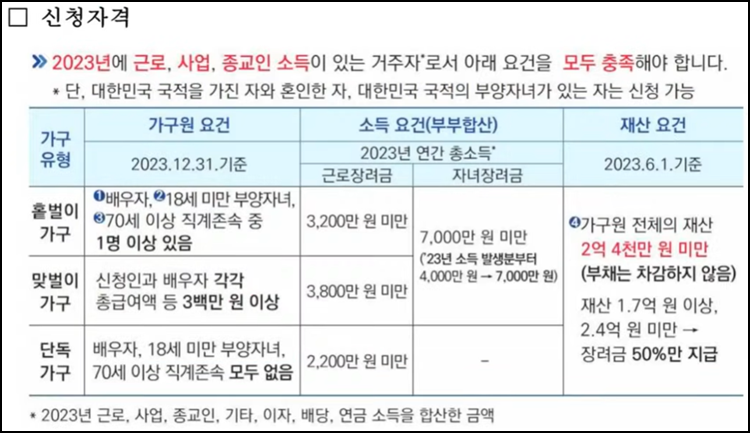 • 재산 합계액이 2억 4000만원 미만 (1억 7000만원 이상 2억 4000만원 미만일 경우 장려금의 절반 지급)