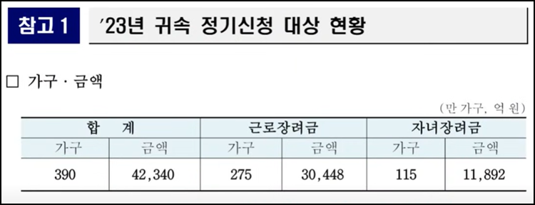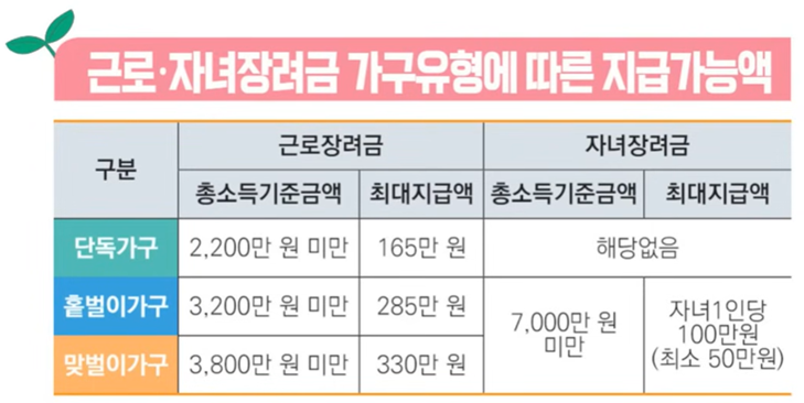 • 자녀: 연소득 400만원 → 근로장려금 165만원