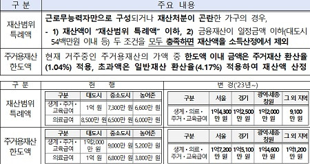 • 자동차 재산 기준 완화: 10년 이상 된 2,000cc 미만 승용차, 가액 500만 원 미만 승용차 등 자동차 재산 기준이 완화되었습니다.
