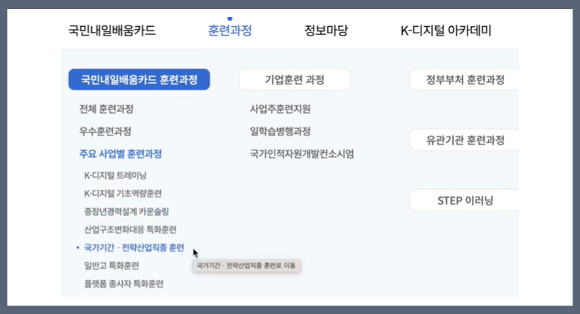 기술 발전과 노동 시장의 변화에 대응하기 위해 생애를 걸쳐 개인의 역량 개발과 직업능력을 향상시킬 수 있도록 훈련비를 지원하는 제도입니다. 국민들이 자기계발을 할 수 있는 시간이 많은 경우, 예를 들어 취업 준비생, 구직자, 주부 등이 주로 이용합니다.