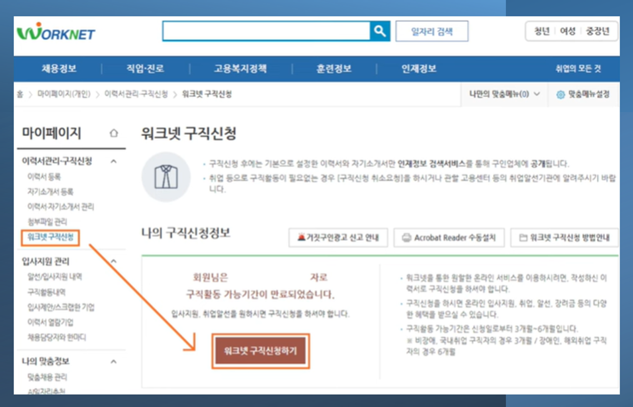 [실업자 자격으로 지원하시려면 워크넷에 구직등록 합니다]