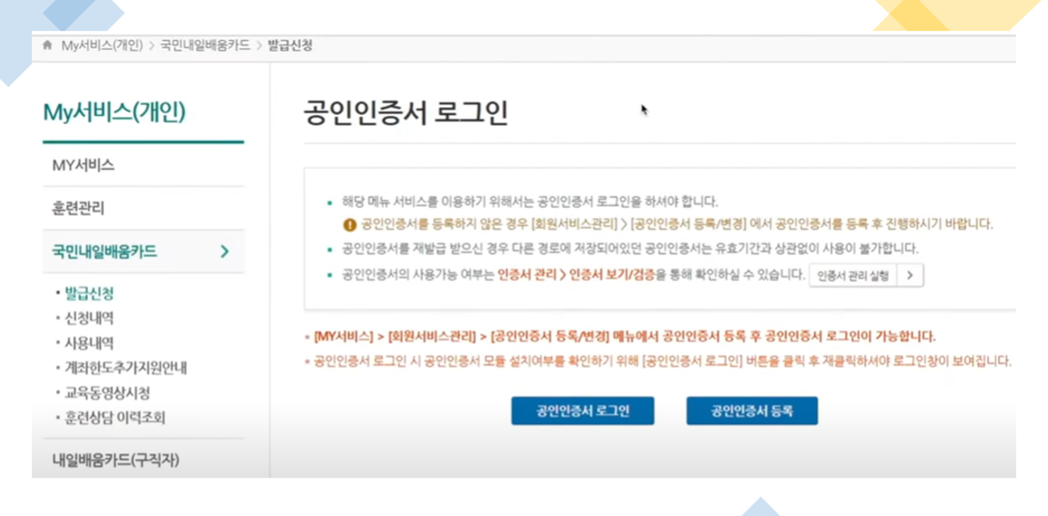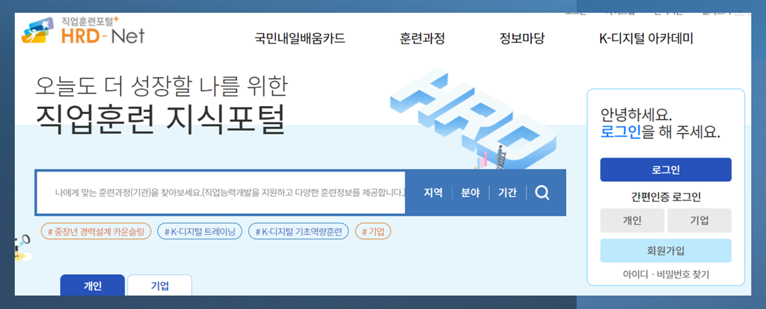 고용노동부의 HRD-Net 홈페이지에서 회원 가입하거나 로그인하여 신청할 수 있습니다. 카카오톡이나 네이버 등 간편 인증을 통해 로그인하면 바로 신청할 수 있습니다.