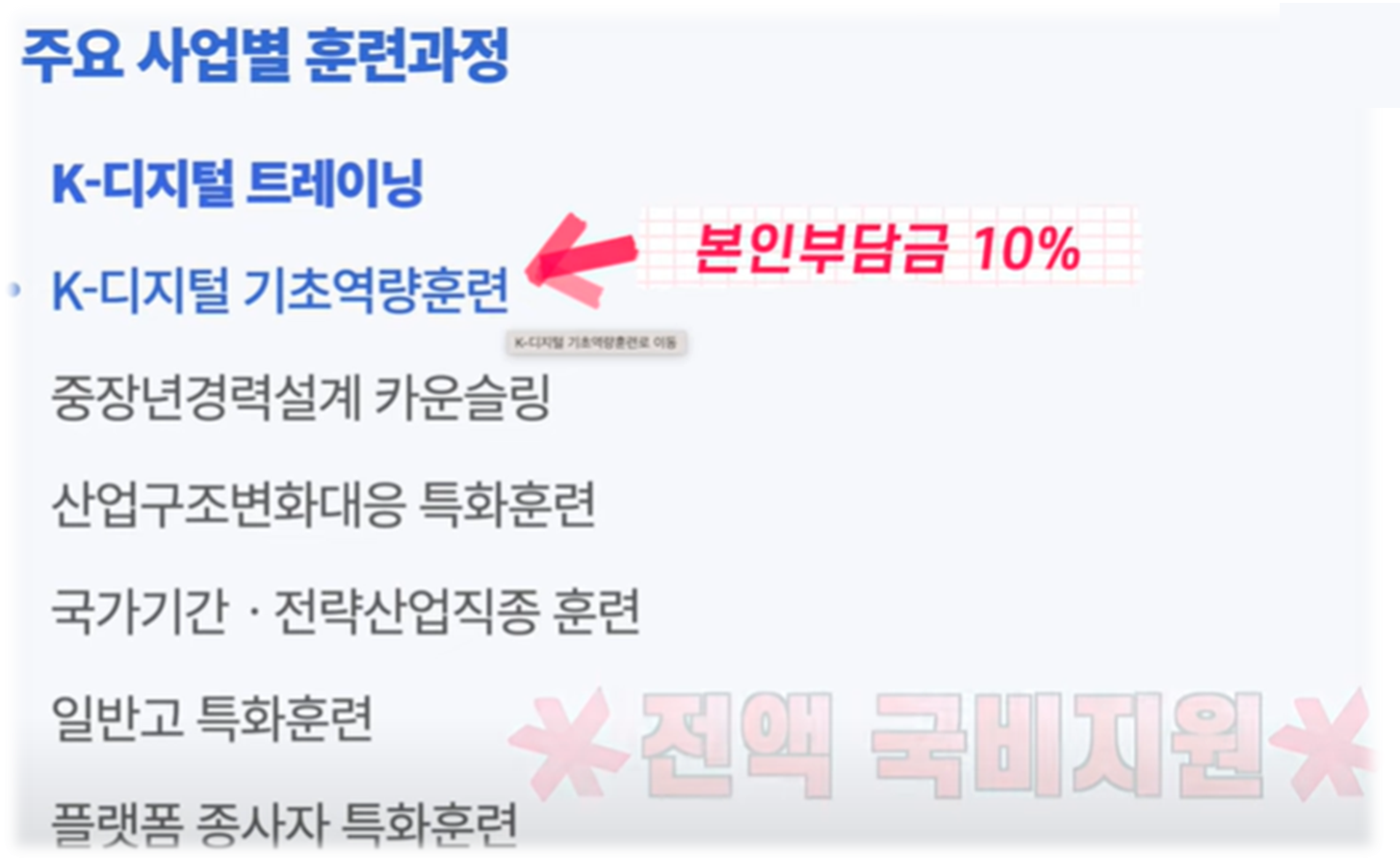 K 디지털 기초 역량 훈련만 자부담금이 10% 발생하고 나머지 여섯 가지는 모두 전액 무료인 가정입니다
