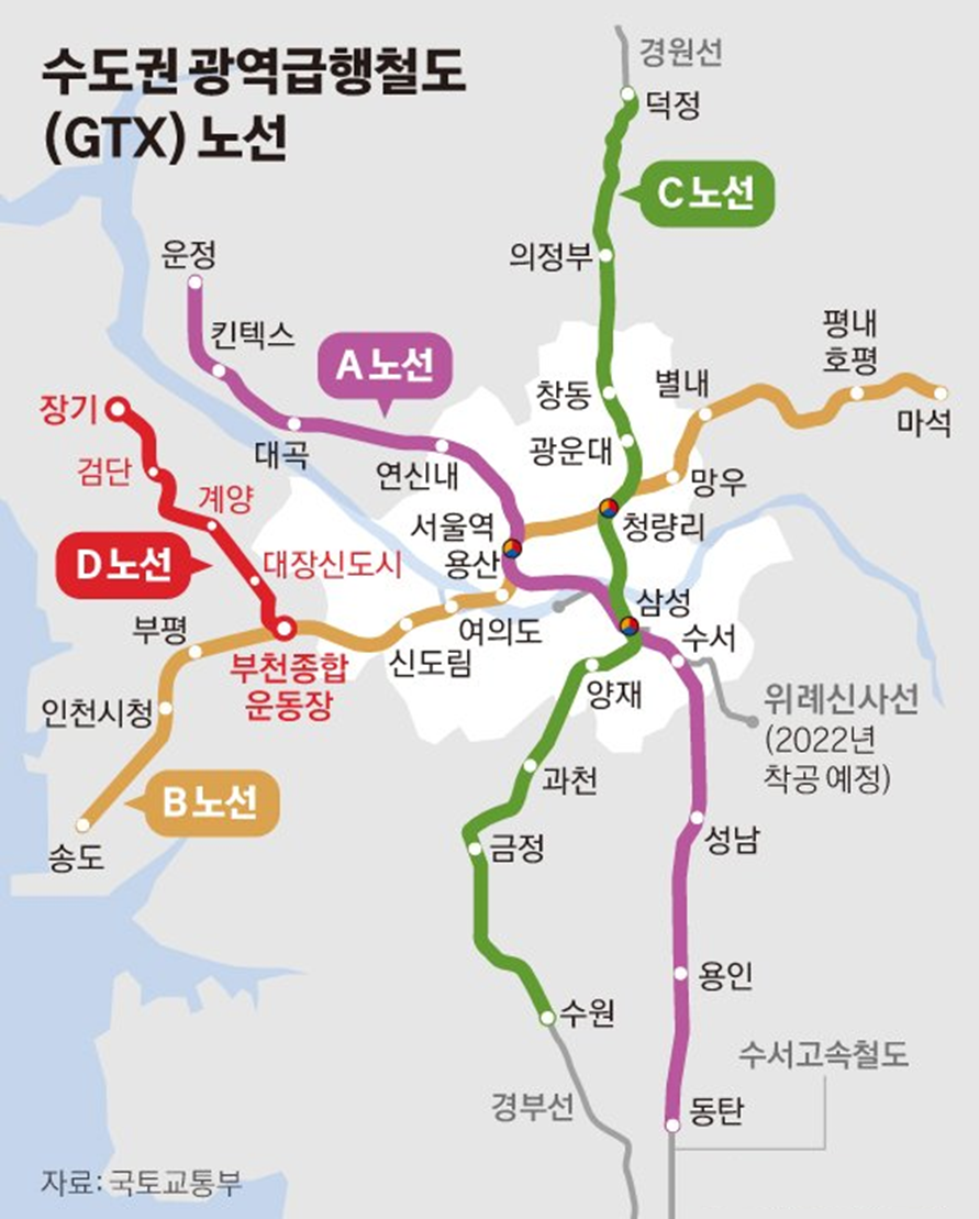 노선 GTX-A, GTX-C, GTX-B 노선도 조기 개통 3기 신도시 부동산 시장 '들썩'