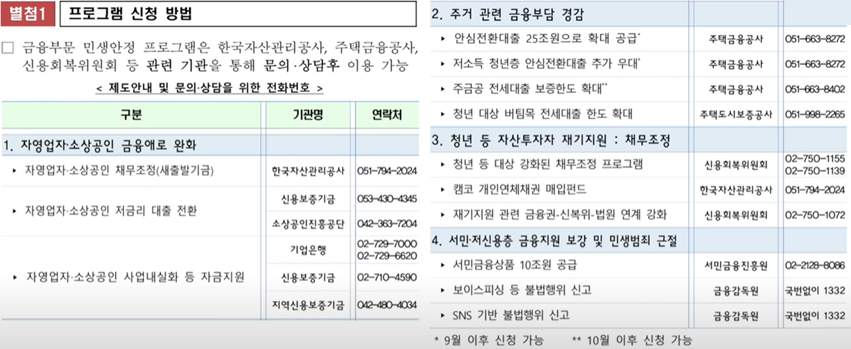 1. 자영업자, 소상공인 지원, 2. 주거관련 지원, 3. 청년 등 재기지원, 4. 서민, 저신용층 금융지원, 5. 시행시기, 신청방법