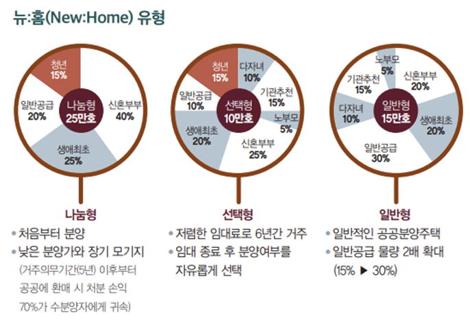 뉴:홈(New:Home)은 청년과 서민의 내집마련 부담을 덜어주는 새로운 주거솔루션입니다. 시세보다 저렴한 가격에 다양한 주거선택권과 획기적인 자금지원을 제공함으로써, 청년과 서민들이 보다 쉽게 내집을 마련할 수 있도록 할 것입니다.