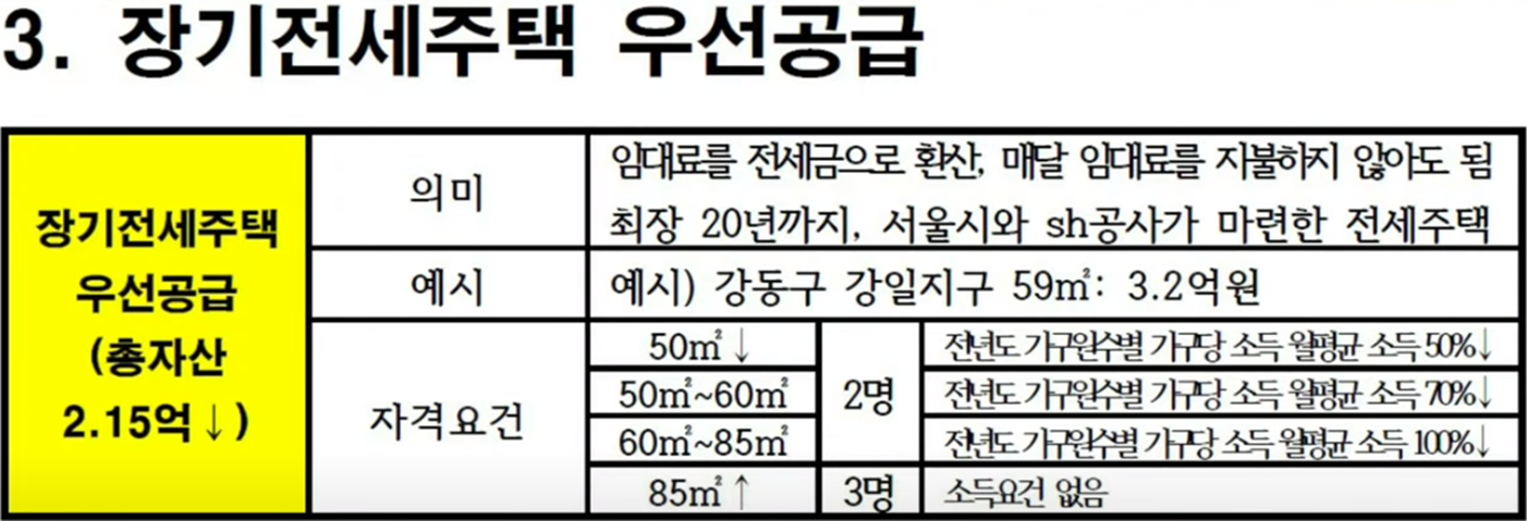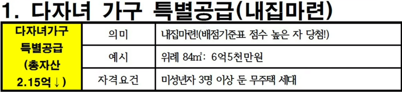 예를 들면 강동구의 강일지구 59제곱미터 25평 정도가 3억 2천만 원에 건조할 수가 있습니다 85 제곱미터 밑으로까지는 자녀가 2명이면 가능하고 85제곱미터 이상이면 즉 32평 이상인 집은 자녀가 3명이면 소득여권의 상관이 없습니다 통자산 2억 1,000만 원 정도면 가능하오니 꼭 확인하시고 신청하시길 바라겠습니다
