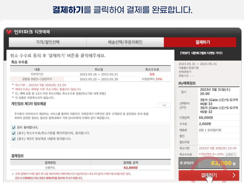 3. 최종 결제 전 취소 수수료 안내 숙지 후 모두 동의합니다 체크박스 클릭하고 결제 진행