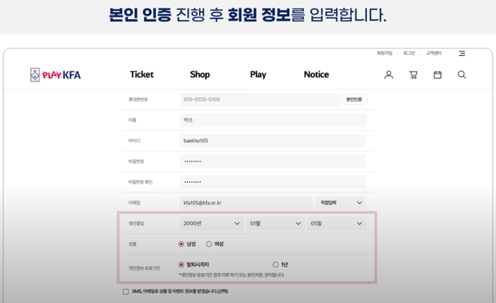 5. 아이디, 비밀번호, 이메일 입력 후 생년월일, 성별, 개인정보 유효기간 등 회원 정보 선택