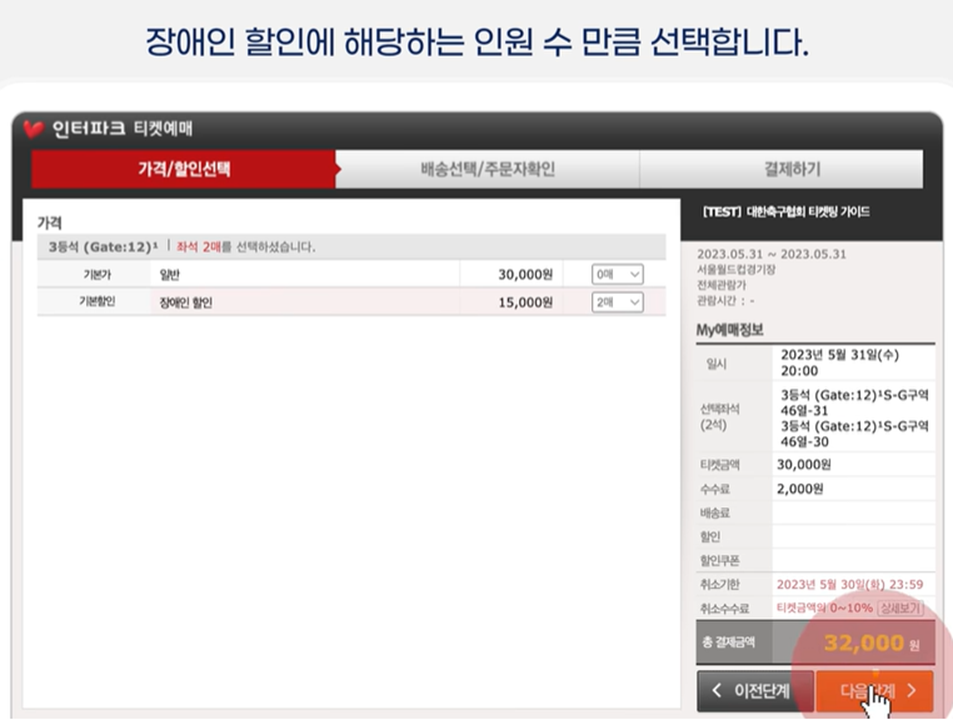 1. 장애인 할인: 해당되는 할인이 있다면 선택 후 다음 단계 클릭 (해당되는 할인이 없다면 기본가를 예매 수만큼 선택하고 예매자 확인 단계로 넘어감)