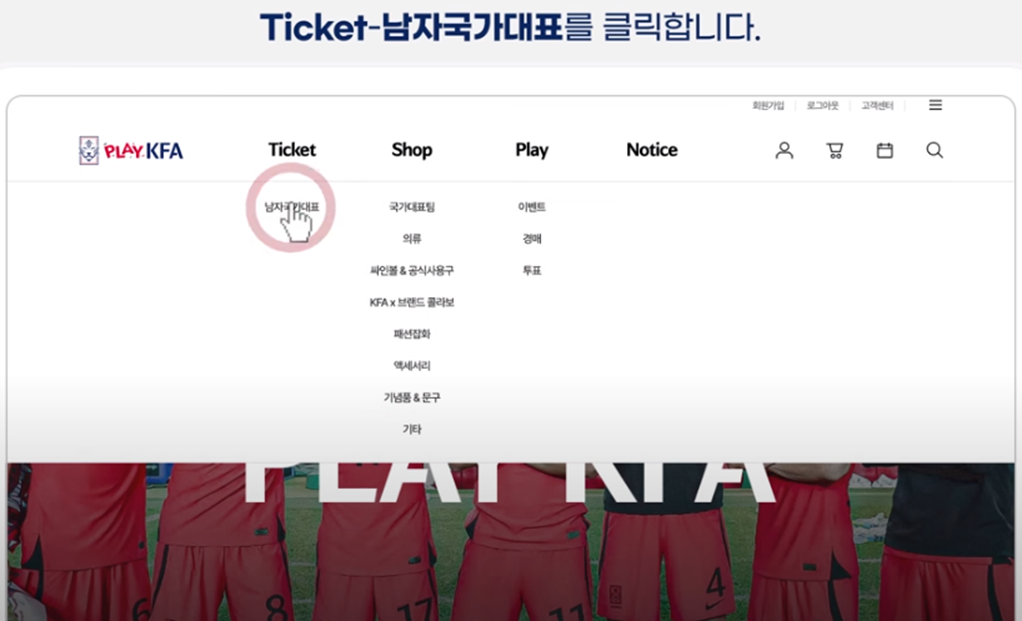 1. 메인 홈페이지 티켓에서 남자 국가대표 카테고리 선택