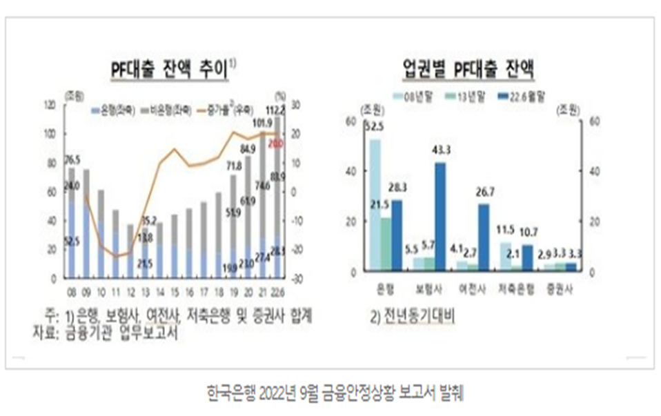 그리고, 역사상 최대 규모의 재건축 사업인 서울 강동구 '둔촌주공'이 공사 중단 등으로 기존 PF가 부도위기에 까지 몰렸다가 만기 하루 전 10월 28일에 가까스로 차환발행에 성공한 바 있는데 그 금리가 12% 안팎인 점에 주목해야 합니다.