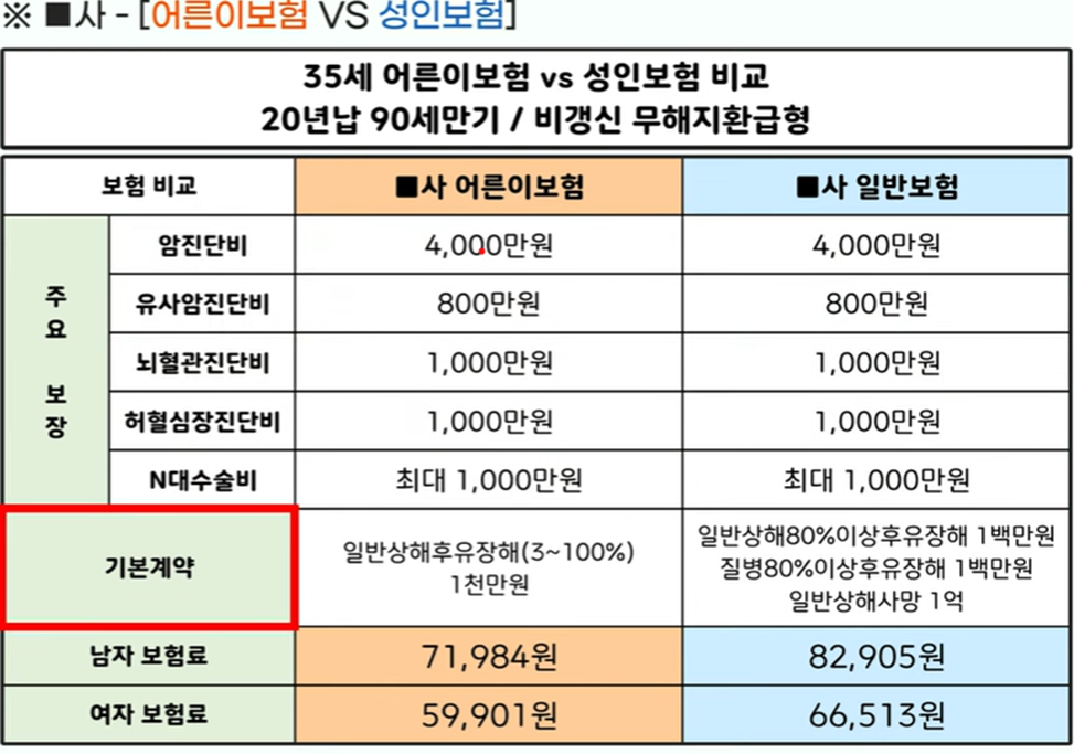 비 갱신 형 어린이 보험 vs 일반 보험 차이 비교
