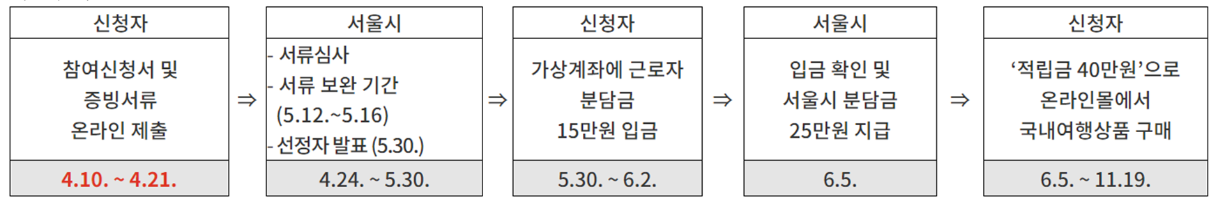 위와 같이, 서울시에서는 1인당 40만원을 지급받는 서울 여행 바우처를 제공하고 있습니다. 이를 받기 위해서는 일정한 대상과 신청기간을 지켜야 하며, 온라인 신을 통해 바우처를 받을 수 있습니다. 자세한 내용은 서울형 여행 바우처 홈페이지에서 확인하시기 바랍니다.