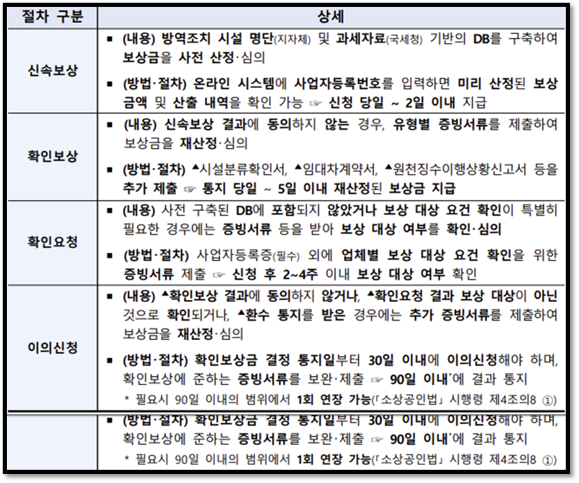1) 온, 오프라인 신청 -> 이의신청 증빙서류 검토 -> 손실보상 심의위원회 심의 -> 보상금 지급 및 증감 여부 결정