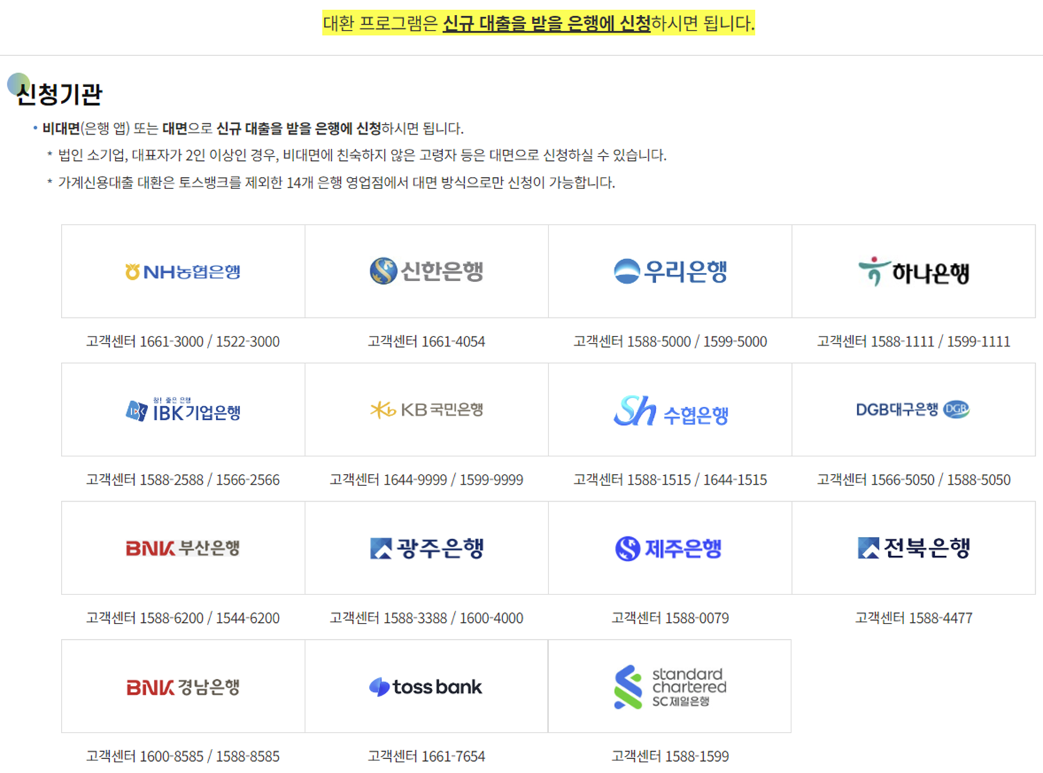 전국 14개 은행 영업점에서 대면으로 신청할 수 있습니다. 신청 시에는 상담원에게 요건을 확인하고, 필요한 서류를 제출하면 됩니다.