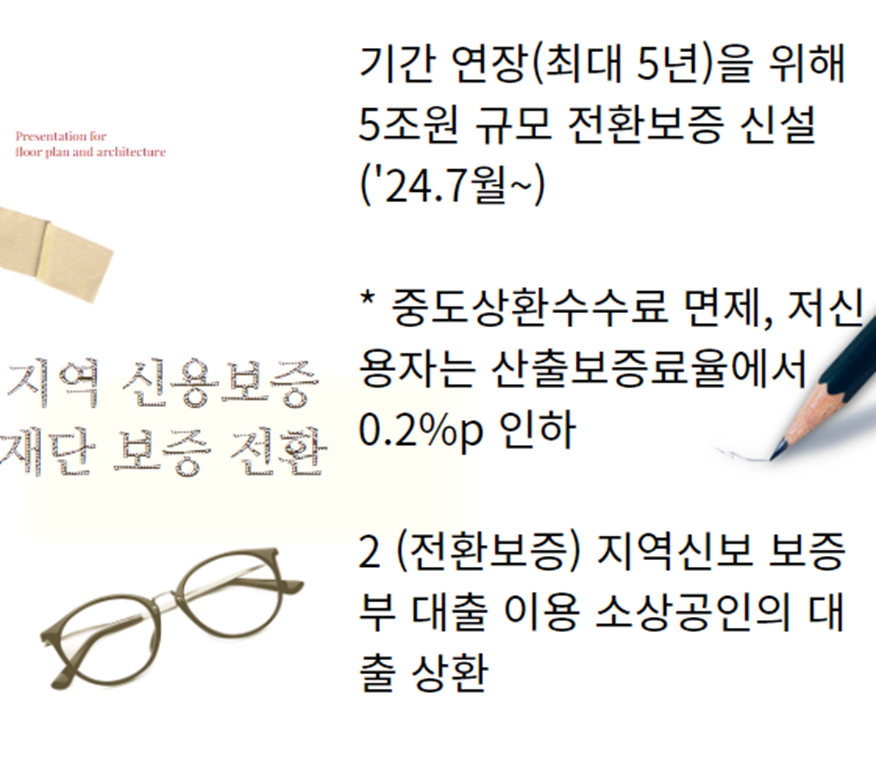 ✅ 보증 전환 상품 지원: 지역 신용보증재단에서 제공하는 기존 보증서 대출을 신규 보증서 대출로 전환할 수 있도록 지원합니다. 이 과정에서 상환 기간이 연장되면 자영업자들이 생존할 수 있는 기간이 길어질 것입니다.