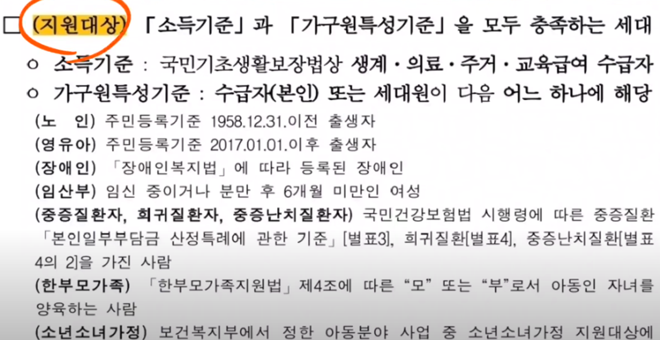 소득 기준: 국민기초생활보장법상 생계급여, 의료급여, 주거급여, 교육급여 수급자
