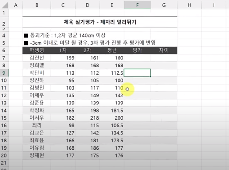 예를 들어 체육 실기평가 점수가 정리되어 있는 표에서 1차와 2차의 평균이 140cm 이상일 경우에만 합격이고, 140cm 미만이어서 불합격일 경우에도 만약 3cm 이내로 미달되었다면 재시험을 볼 수 있도록 표를 완성해 보겠습니다.
