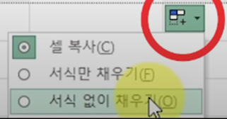 2. 아래로 서식을 복사하여 붙여놓고 자동채우기 옵션에서 서식 없이 채우기를 선택 클릭