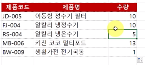 VLOOKUP함수는 많은 양의 데이터가 있을 때 내가 원하는 특정값의 정보를 찾아주는 함수입니다. 예를 들어 오른쪽에 있는 표에서 제품코드가 JD-005 라는 제품의 제품명과 수량을 찾아보겠습니다.