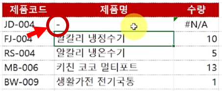 IFERROR함수는 안에 입력된 값이 오류를 출력할 때 오류 대신 다른 값을 표시하는 함수입니다. 예를 들어서, 이 제품 코드에서 JD-005 를 JD-004 로 바꿔 볼게요. 그러면 이런 식으로 이 제품 코드는 왼쪽에 있는 제품 목록에 없는 값이기 때문에 이렇게 #N/A 오류가 반환됩니다. 그래서 이럴 때에는 IFERROR함수를 사용해서 오류 대신 다른 값을 표시하면 더 깔끔한 보고서를 만들 수 있습니다. 함수 서식은 =IFERROR(VLOOKUP(H5,$B$4:$F$19,2,0),"-")