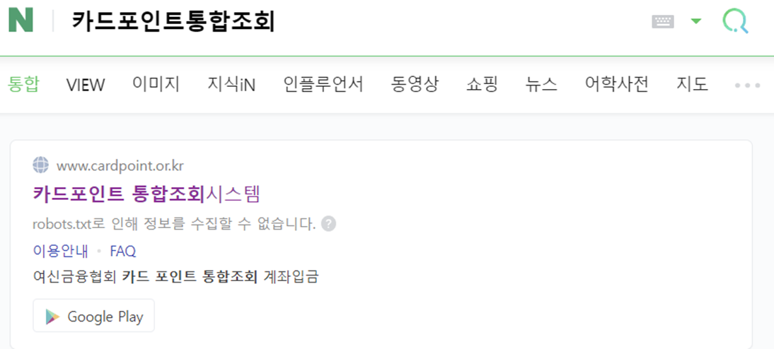 네이버에서 "카드포인스 통합조회"를 검색하여 국가에서 운영하는 사이트 '여신금융협회' 접속합니다.