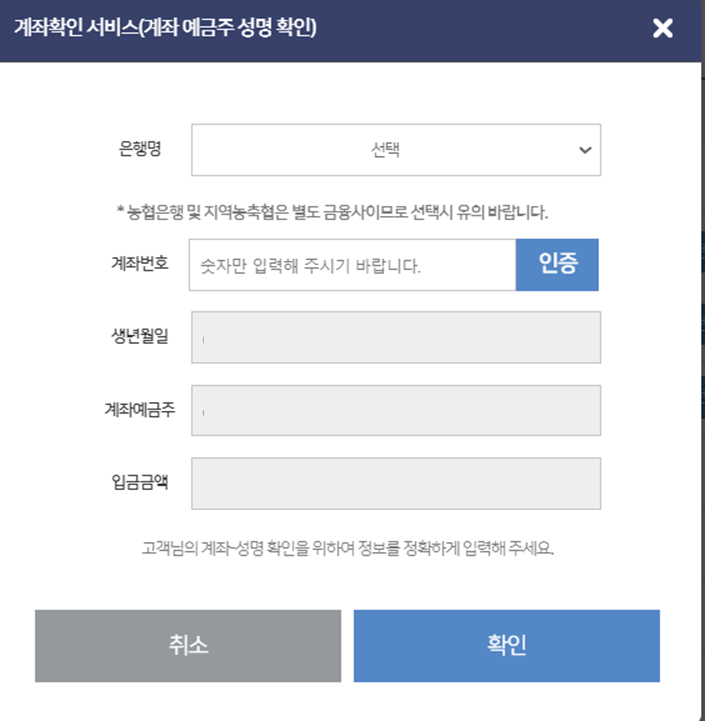 본인 은행명과 계좌번호를 입력후 '확인'(클릭) 완료 입니다
