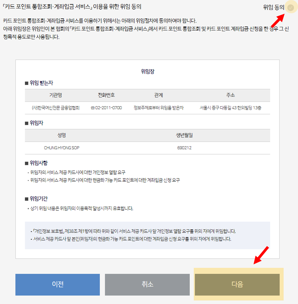 우측상단 '위임동의'(클릭) >> 우측하단 '다음'(클릭) >> '카드포인트 계좌입금/기부'(클릭)