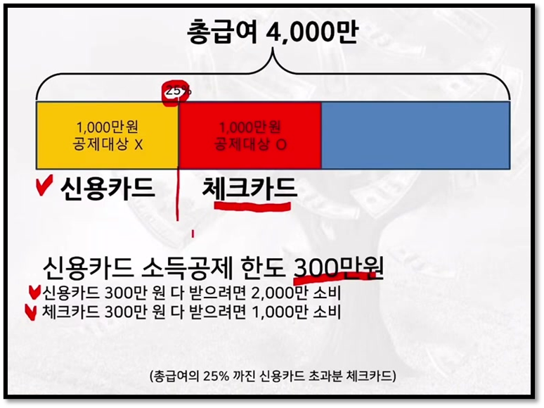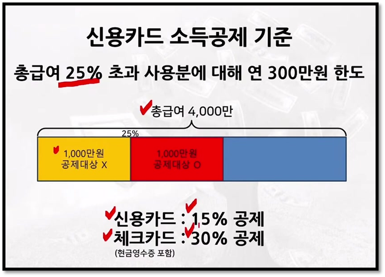 신용카드 소득공제 기준에서 25% 초과 사용분은 연 300만원 한도로 적용되는데, 이를 모르고 계신 분들이 많습니다.