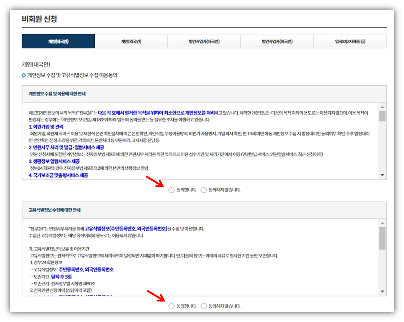 비회원 신청하기로 선택하고 약관에 동의한 후 정보 입력을 완료하고 다음 단계로 넘어갑니다.